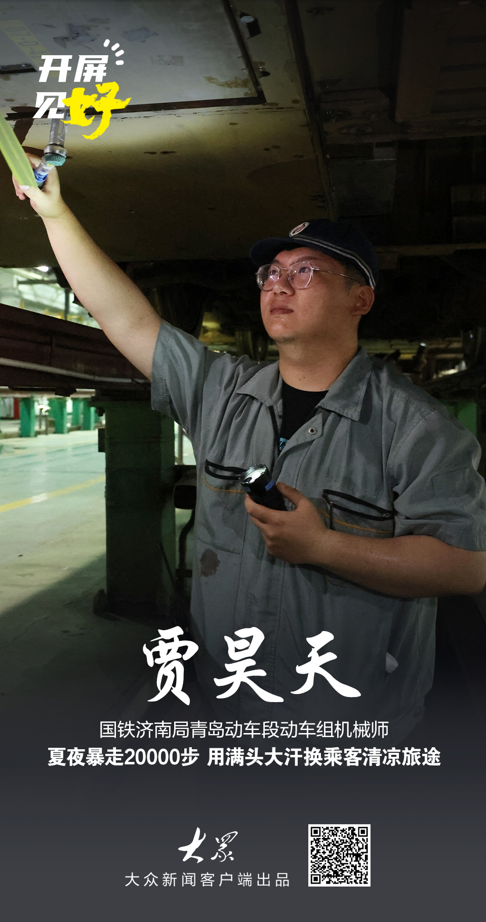 在温度格外高的列车底部,有一个身影频繁地钻进钻出,打着手电筒,四处敲打摸索。他叫贾昊天,是国铁济南局青岛动车段动车组机械师,正忙着检查空调系统——这份在深夜与高温“较劲”的工作,关系着白天数万旅客的旅途舒适度。
